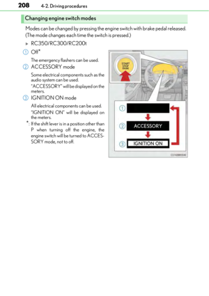 4-2. Driving procedures Engine (ignition) switch ........... 207