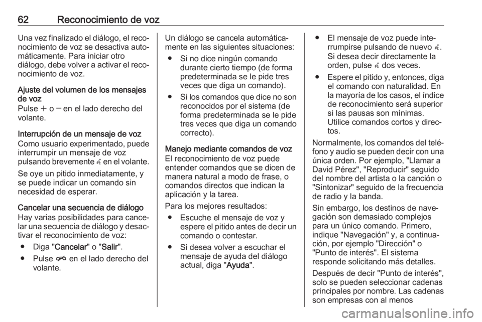64Reconocimiento de vozVista general de los comandos de vozEn la tabla siguiente se incluye una vista general de los comandos de voz más importantes.MenúAcciónComandos de vozTodos los
