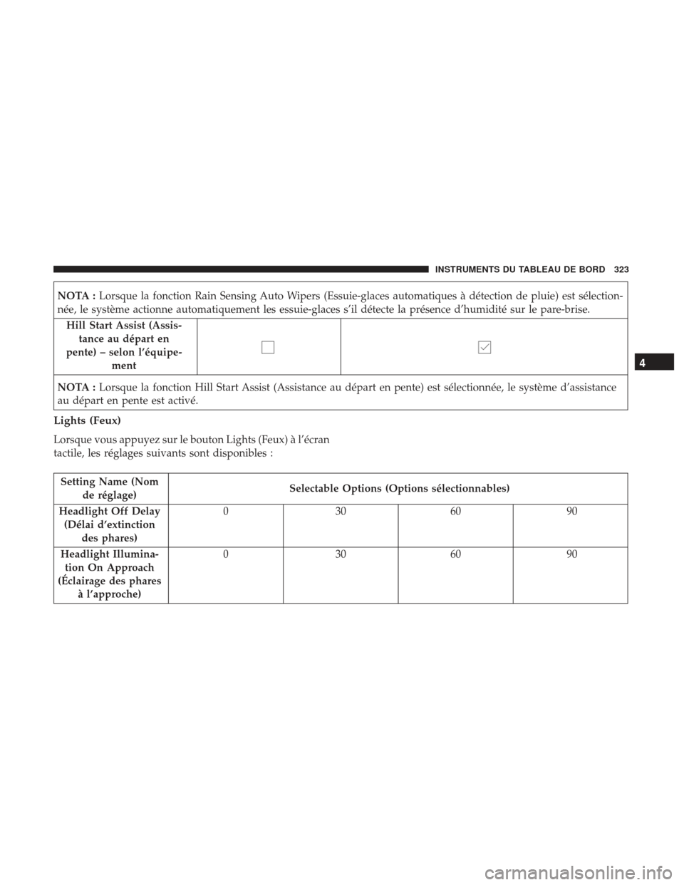 7 Headlights Off Delay (Délai d’extinction des phares) Lights Off Delay (Délai