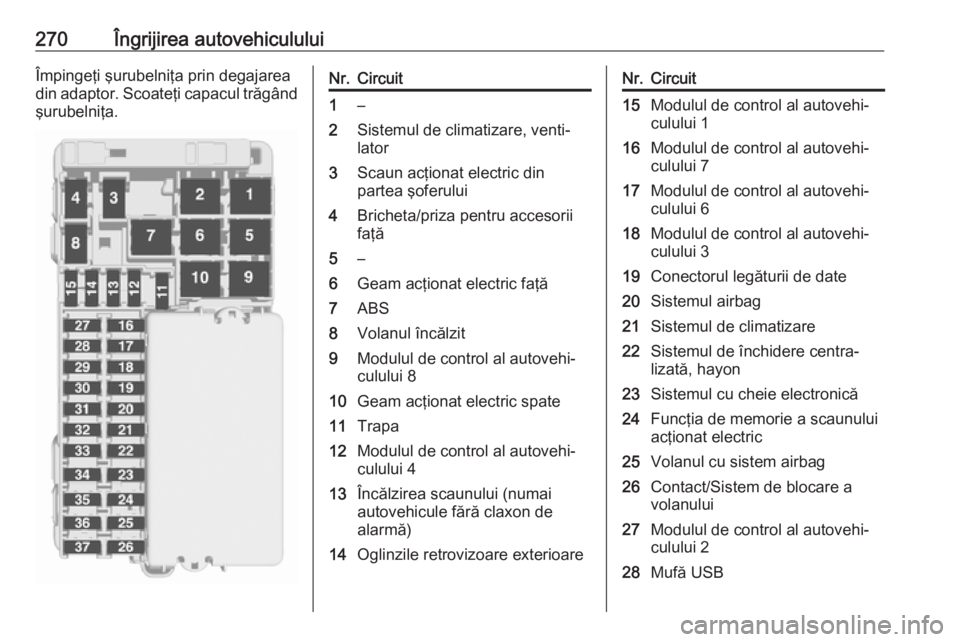 Îngrijirea autovehiculului271Nr.Circuit29–30Maneta selectorului de viteze31Ştergătorul de lunetă32Modulul de comandă al transmi‐siei33Sistemul de alarmă antifurt/