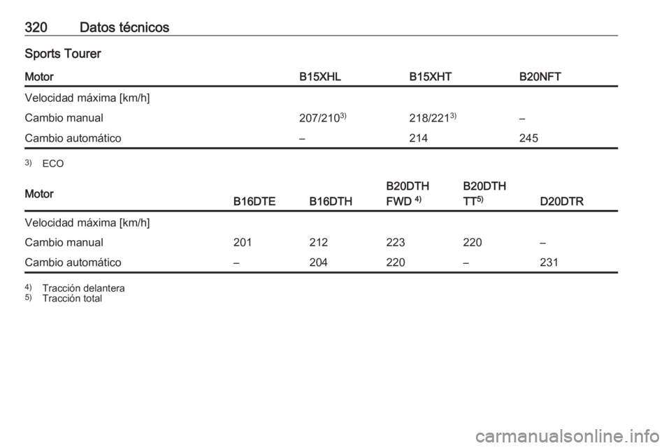 320Datos técnicosSports TourerMotorB15XHLB15XHTB20NFTVelocidad máxima [km/h]Cambio manual207/2103)218/2213)–Cambio automático–2142453)