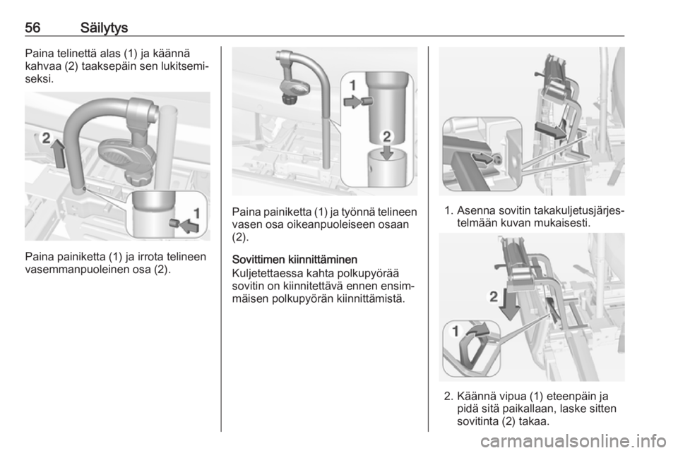 58Säilytys3. Kiinnitä polkupyörän molemmatpyörät kiinnityshihnoilla pyöräkiin‐nikkeisiin.
