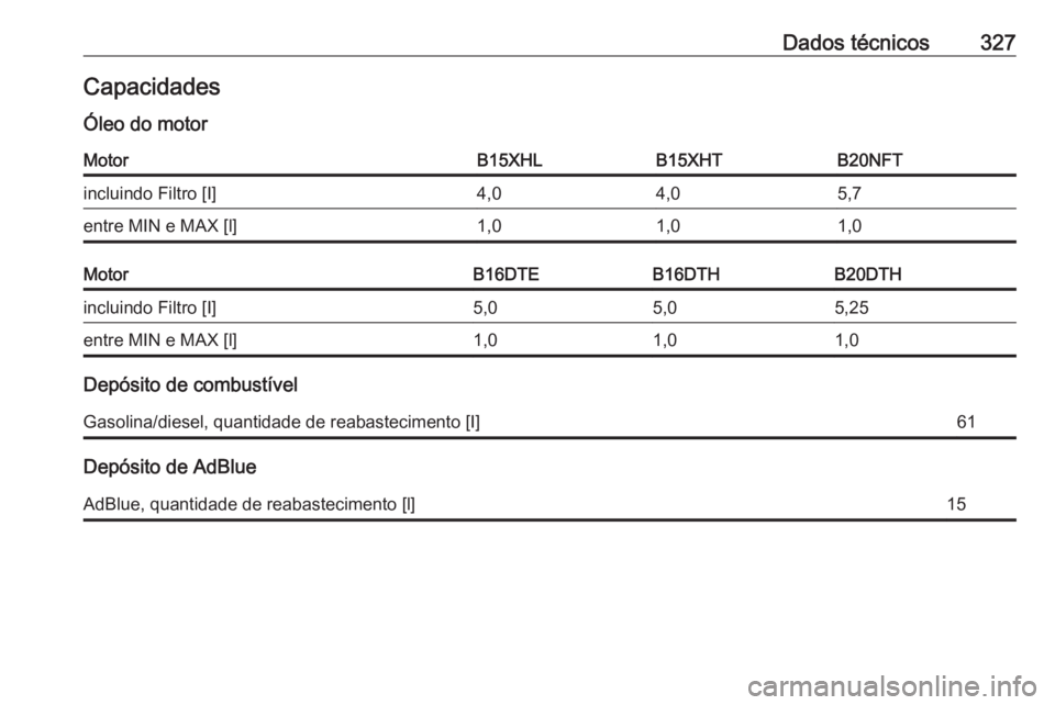Dados técnicos327CapacidadesÓleo do motorMotorB15XHLB15XHTB20NFTincluindo Filtro [I]4,04,05,7entre MIN e MAX [l]1,01,01,0MotorB16DTEB16DTHB20DTHincluindo Filtro [I]5,05,05,25entre MIN e MAX [l]1,01,01,0