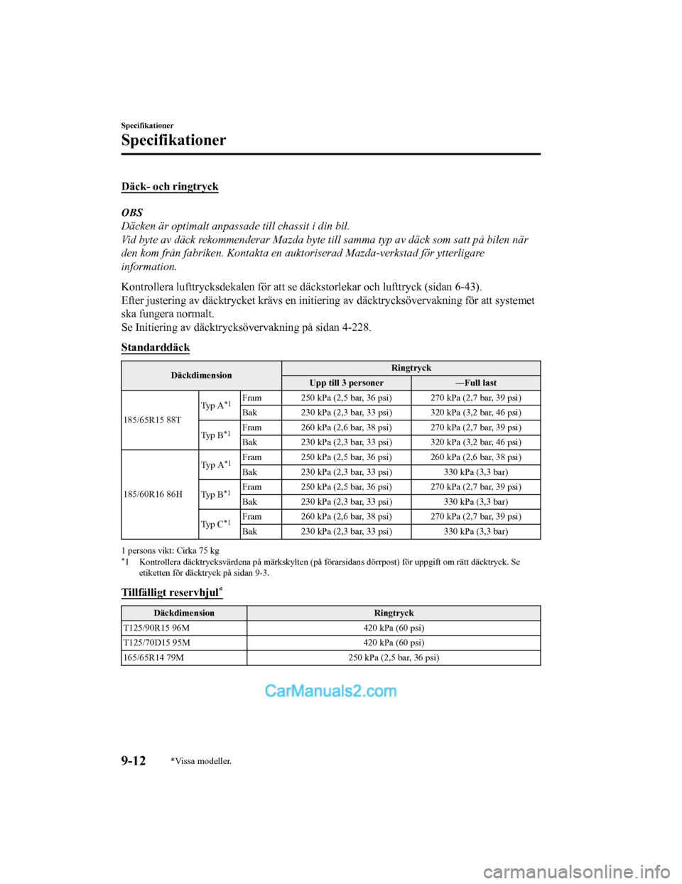 1 persons vikt: Cirka 75 kg*1 Kontrollera däcktrycksvärdena på märkskylten (på förarsidans d örrpost) för uppgift om rätt däcktryck. Se