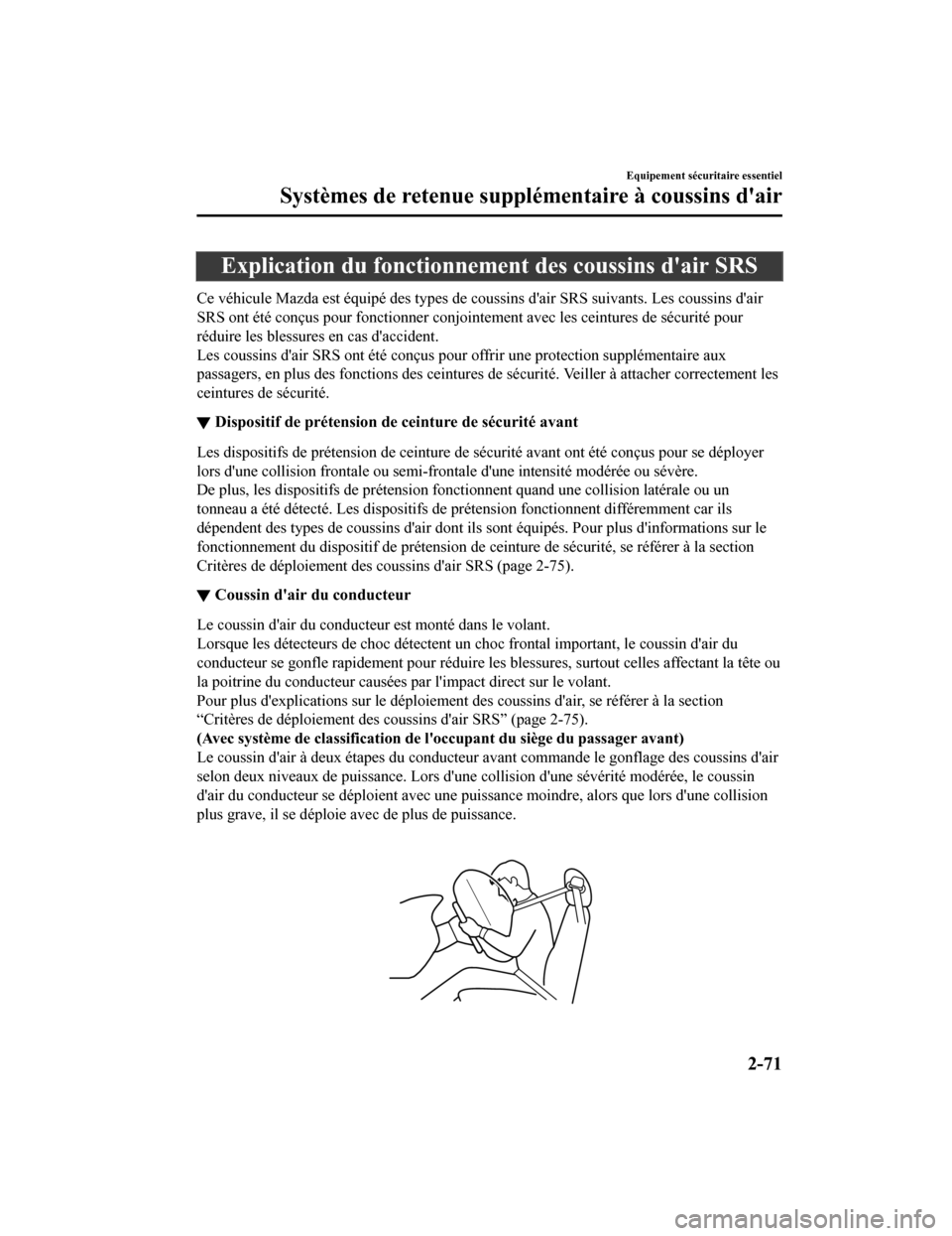 Ce véhicule Mazda est équipé des types de coussins d'air SRS suivants. Les coussins d'air