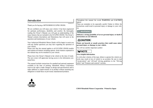 personal injury or damage to your vehicle. You will see another important symbol: Gives helpful information. As with other vehicles of this type, failure to operate this vehicle cor- rectly may result in loss of control or an accident. Be sure to read “on-pavement” and “off-road” driving guidelines in the “Drivingsafety” and “Features and controls” sections.©2018 Mitsubishi Motors Corp