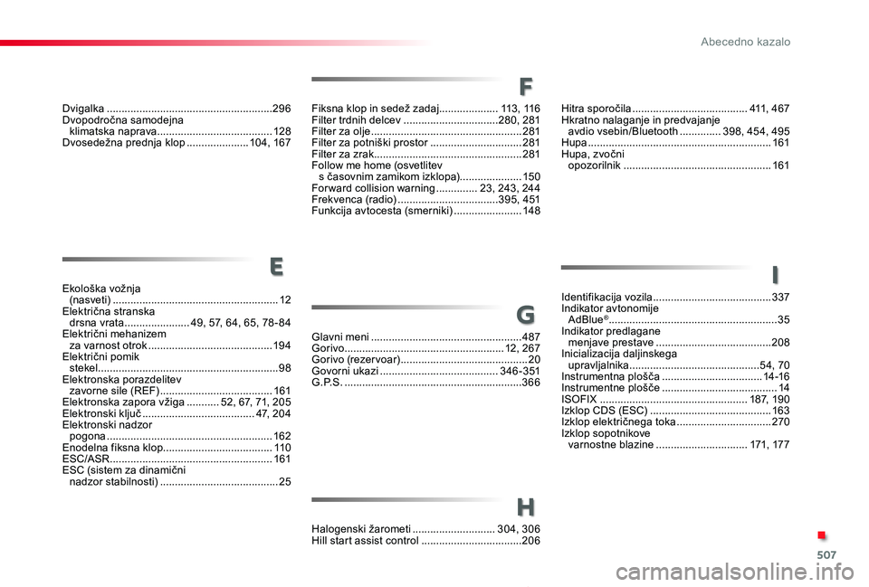 Fiksna klop in sedež zadaj....................113, 11 6Filter trdnih delcev ................................280, 281Filter za olje ...................................................281Filter za potniški prostor ...............................281Filter za zrak ..................................................281Follow me home (osvetlitev s časovnim zamikom izklopa) .....................15 0For ward collision warning ..............23, 243, 244Frekvenca (radio) ..................................395, 4 51Funkcija avtocesta (smerniki) .......................148