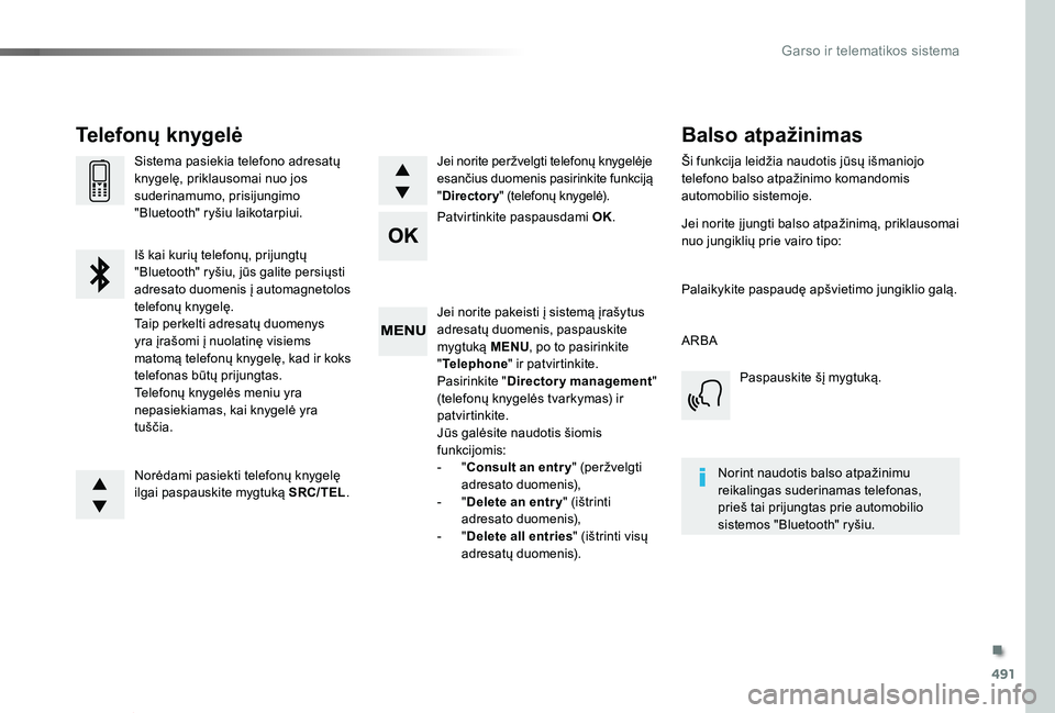 Jei norite pakeisti į sistemą įrašytus adresatų duomenis, paspauskite mygtuką MENU, po to pasirinkite "Telephone" ir patvirtinkite.Pasirinkite "Directory management" (telefonų knygelės tvarkymas) ir patvirtinkite.Jūs galėsite naudotis šiomis funkcijomis:- "Consult an entr y" (peržvelgti adresato duomenis),- "Delete an entry" (ištrinti adresato duomenis),- "Delete all entries" (ištrinti visų adresatų duomenis).
