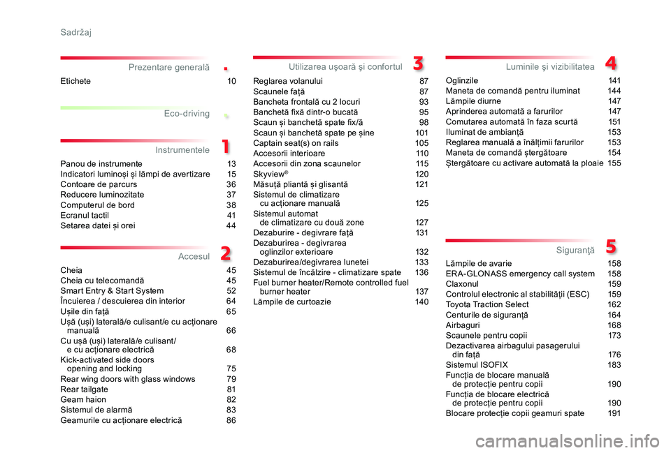 Lămpile de avarie 158ER A-GLONASS emergency call system 15 8Cla xonul 159Controlul electronic al stabilității (ESC) 159Toyota Traction Select 162Centurile de siguranță 164Airbaguri 168Scaunele pentru copii 173Dezactivarea airbagului pasagerului din față 176Sistemul ISOFIX 183Funcția de blocare manuală de protecție pentru copii 190Funcția de blocare electrică de protecție pentru copii 190Blocare protecție copii geamuri spate 191