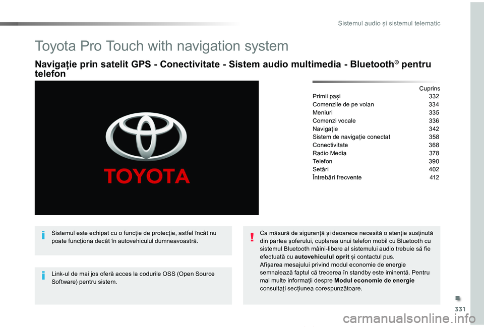 Urgență sau asistență 328Toyota Pro Touch with navigation system 331Toyota Pro Touch 419Toyota Radio Bluetooth 473