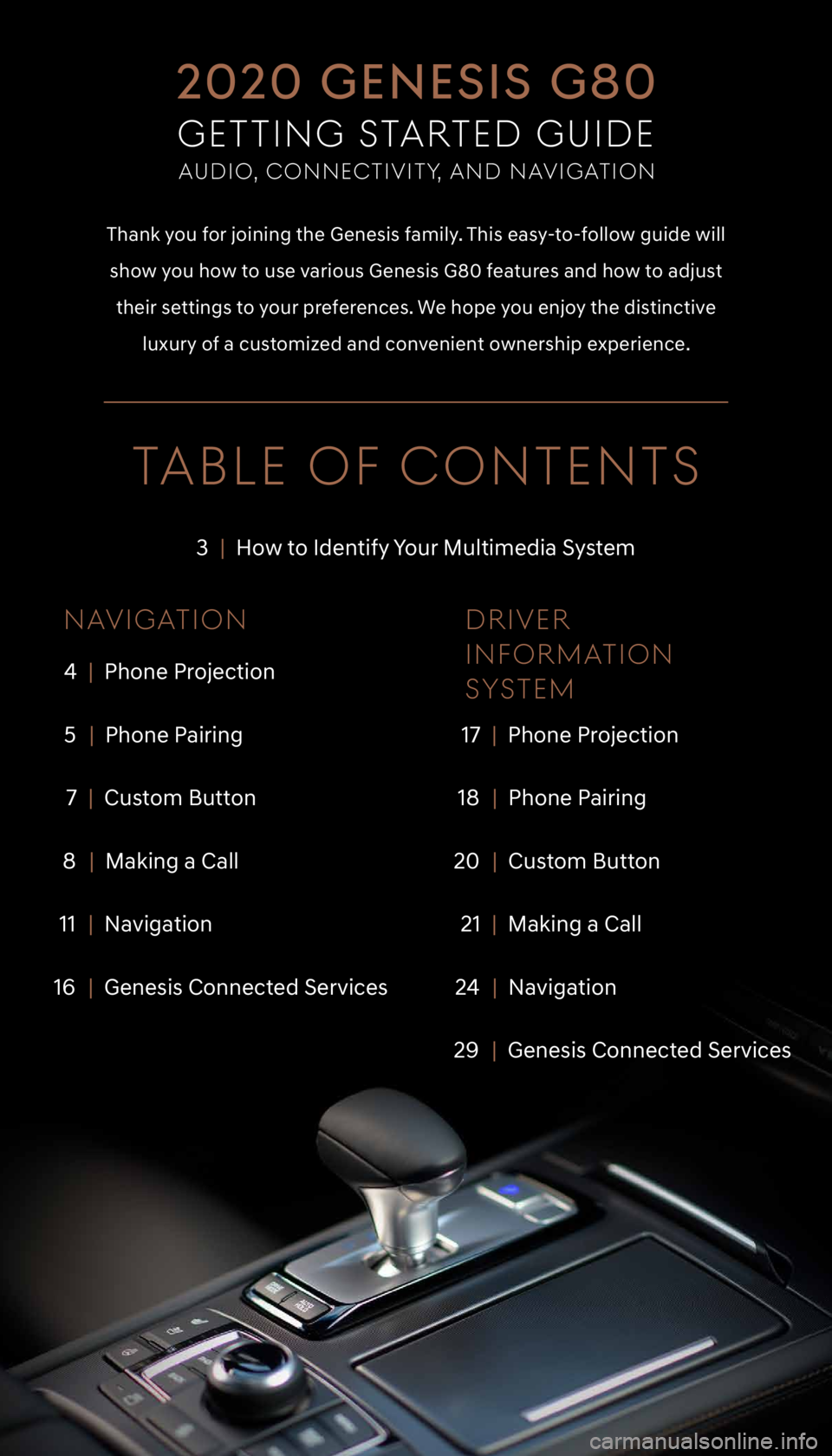 Thank you for joining the Genesis family. This easy-to-follow guide will show you how to use various Genesis G80 features and how to adjust their settings to your preferences. We hope you enjoy the distinctive luxury of a customized and convenient ownership experience.