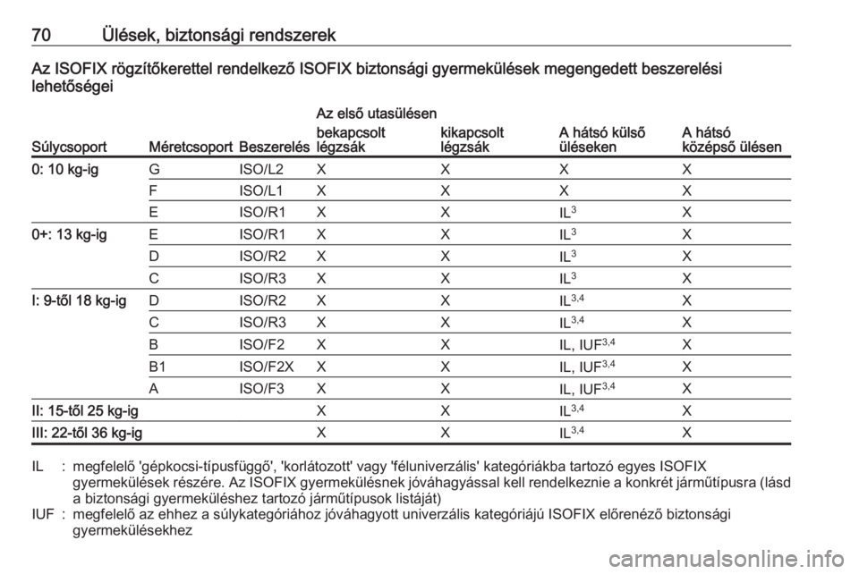 70Ülések, biztonsági rendszerekAz ISOFIX rögzítőkerettel rendelkező ISOFIX biztonsági gyermekülések megengedett beszerelési
