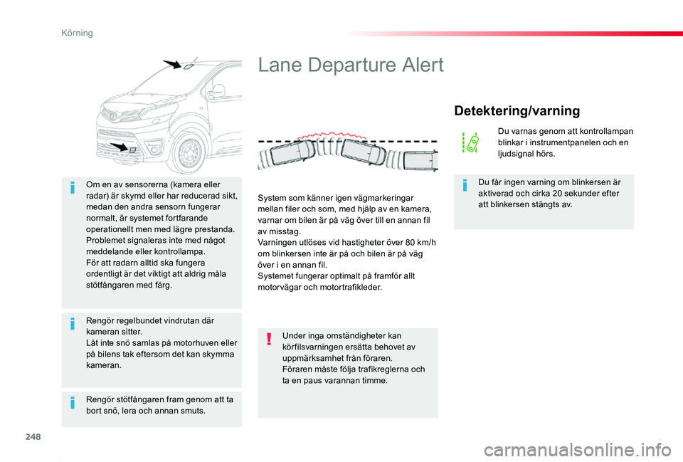 Systemet kan tillfälligt störas vid vissa väderförhållanden (regn, hagel etc.).Falska varningar kan till exempel uppstå vid körning på våta vägbanor eller vid passage från en torr till en våt vägbana (t.ex. kan vattendimma i den döda vinkeln tolkas som ett fordon).Vid dåligt väder eller under vintern bör du försäkra dig om att sensorerna inte täcks av smuts, frost eller snö.Se till att inte täcka över varningsområdet på sidospegeln eller detekteringsområdena på stötfångarna fram och bak, med klisterlappar eller andra föremål. De riskerar att störa systemets funktion.