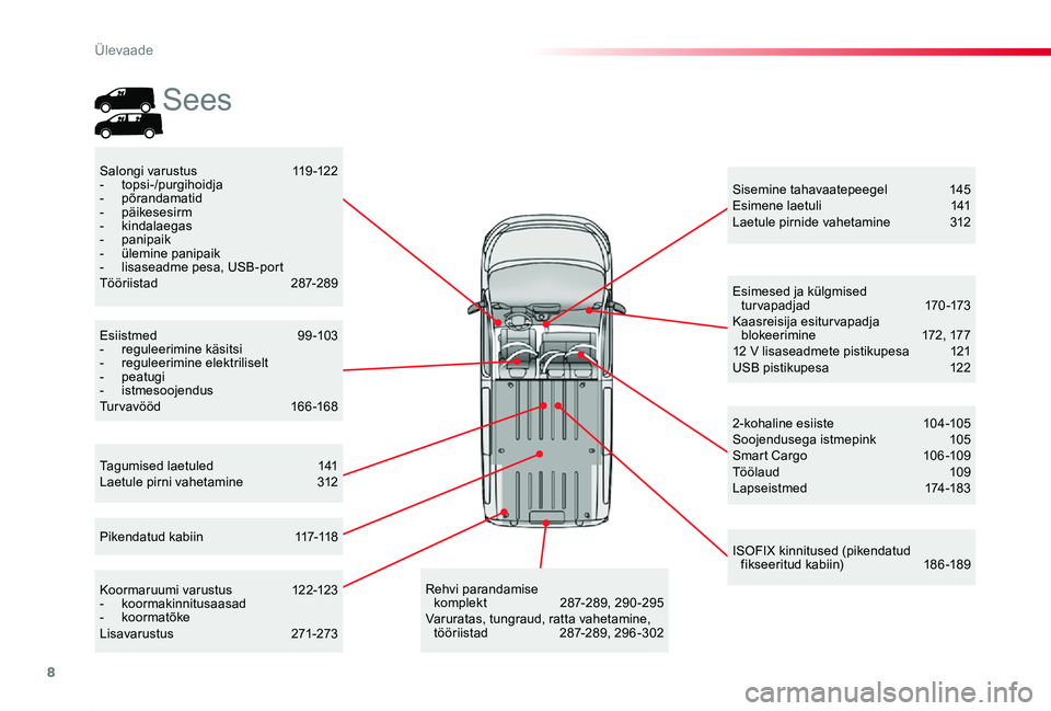 Salongi varustus 119-122- topsi-/purgihoidja- põrandamatid- päikesesirm- kindalaegas- panipaik- ülemine panipaik- lisaseadme pesa, USB-portTööriistad 287-289