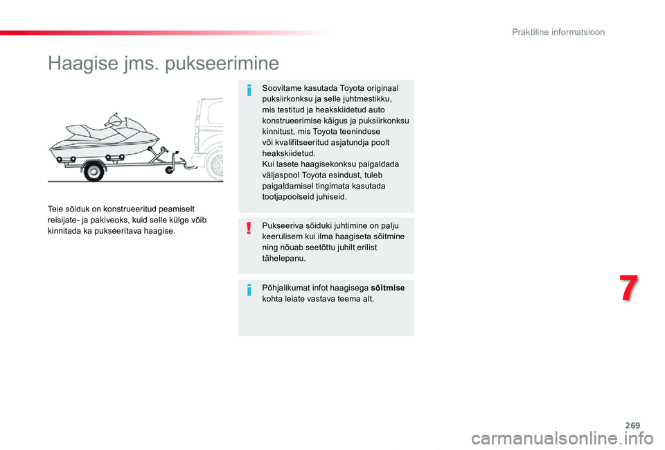 Soovitame kasutada Toyota originaal puksiirkonksu ja selle juhtmestikku, mis testitud ja heakskiidetud auto konstrueerimise käigus ja puksiirkonksu kinnitust, mis Toyota teeninduse või kvalifitseeritud asjatundja poolt heakskiidetud.Kui lasete haagisekonksu paigaldada