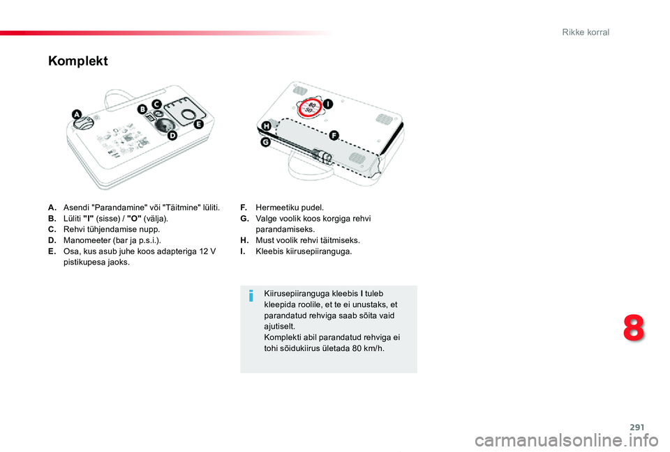 F. Hermeetiku pudel.G. Valge voolik koos korgiga rehvi parandamiseks.H. Must voolik rehvi täitmiseks.I. Kleebis kiirusepiiranguga.