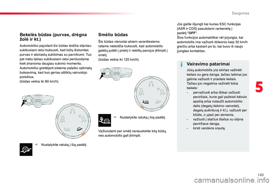 Jūs galite išjungti kai kurias ESC funkcijas (ASR ir CDS) pasukdami rankenėlę į padėtį "OFF".Šios funkcijos automatiškai vėl įsijungia, kai automobilis ima važiuoti didesniu kaip 50 km/h greičiu arba kaskart po to, kai buvo iš naujo įjungtas kontaktas.