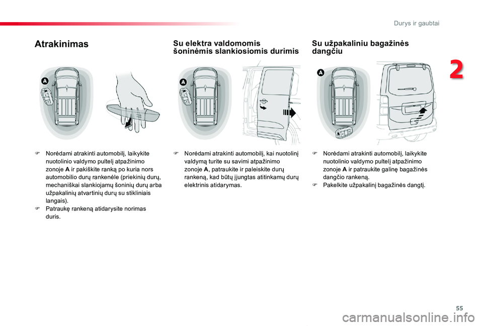 F Norėdami atrakinti automobilį, laikykite nuotolinio valdymo pultelį atpažinimo zonoje A ir pakiškite ranką po kuria nors automobilio durų rankenėle (priekinių durų, mechaniškai slankiojamų šoninių durų arba užpakalinių atvartinių durų su stikliniais langais).F Patraukę rankeną atidarysite norimas duris.