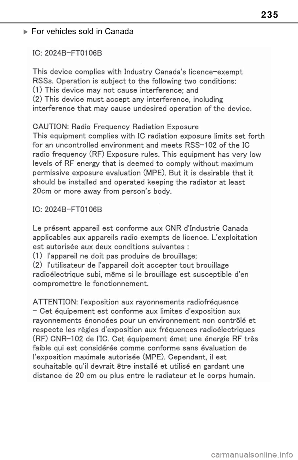 234 For vehicles sold in the U.S.A., Hawaii, Guam, Saipan, American Samoa and Puerto Rico Cer tification