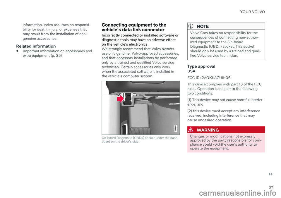 We strongly recommend that Volvo owners use only genuine, Volvo-approved accessories,and that accessory installations be performedonly by a trained and qualified Volvo servicetechnician. Certain accessories only workwhen the associated software is installed inthe vehicle's computer system.