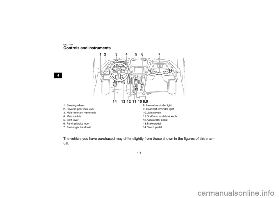 EBU31200Controls and instrumentsThe vehicle you have purchased may differ slightly from those shown in the figures of this man-