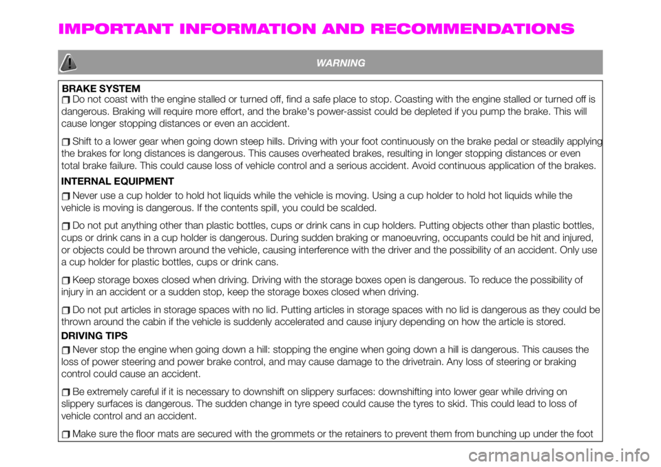 BRAKE SYSTEMDo not coast with the engine stalled or turned off, find a safe place to stop. Coasting with the engine stalled or turned off is