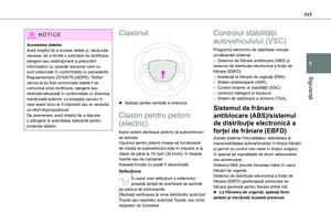 5SiguranțăRecomandări generale cu privire la siguranță 11 4Lămpile de avarie 11 5Urgență sau asistență 11 5Claxonul 11 7Claxon pentru pietoni (electric) 11 7Controlul stabilității autovehiculului (VSC) 11 7Toyota Traction Select 121Centurile de siguranță 122Airbaguri 126Scaunele pentru copii 130Dezactivarea airbagului pasagerului din față 132Scaune pentru copii ISOFIX și scaune pentru copii ce respectă regulamentul european i-Size 139Scaune pentru copii ce respectă regulamentul european i-Size 151Funcția de blocare manuală de protecție pentru copii 154Funcția de blocare electrică de protecție pentru copii 154Blocare protecție copii geamuri spate 155