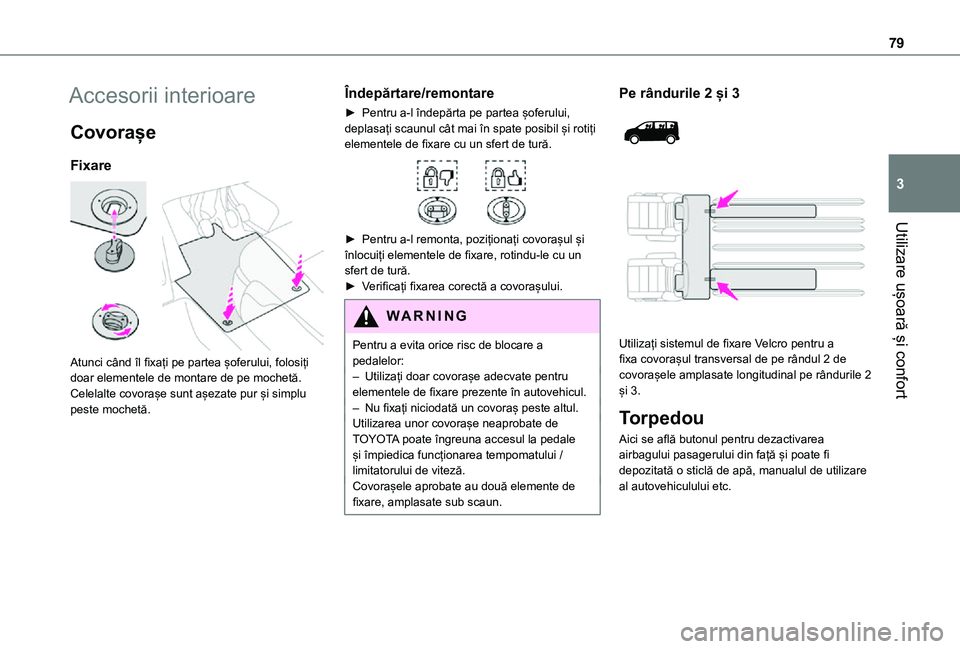 Pentru a evita orice risc de blocare a pedalelor:– Utilizați doar covorașe adecvate pentru elementele de fixare prezente în autovehicul.– Nu fixați niciodată un covoraș peste altul.Utilizarea unor covorașe neaprobate de TOYOTA poate îngreuna accesul la pedale și împiedica funcționarea tempomatului / limitatorului de viteză.Covorașele aprobate au două elemente de fixare, amplasate sub scaun.