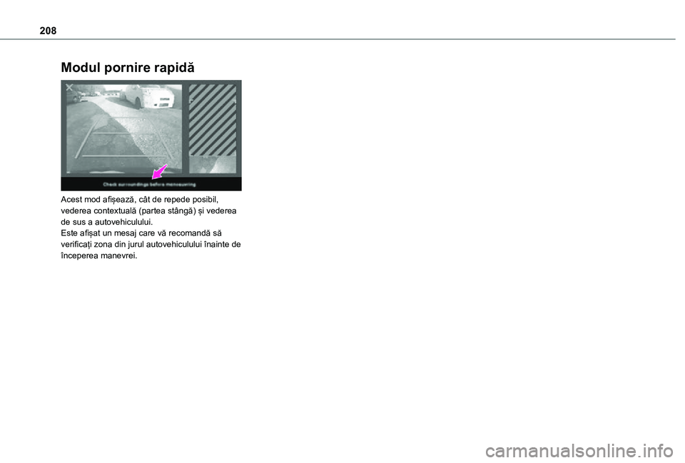 Acest mod afișează, cât de repede posibil, vederea contextuală (partea stângă) și vederea de sus a autovehiculului.Este afișat un mesaj care vă recomandă să verificați zona din jurul autovehiculului înainte de începerea manevrei.